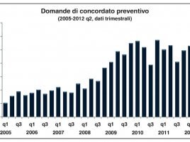 Secondo gli archivi di Cerved Group, tra marzo e giugno del 2012 sono state aperte circa 3.300 procedure fallimentari, il 3,2 per cento in meno rispetto allo stesso periodo del 2011. Il dato del secondo trimestre, pur interrompendo la lunga corsa dei default (sedici trimestri consecutivi di incrementi su base annua), rimane elevato in termini assoluti (+10 per cento rispetto al dato del 2010 e +37 per cento rispetto a quello del 2009) e porta a 6.500 il totale dei fallimenti nei primi sei mesi dell’anno, in leggero aumento rispetto al primo semestre 2011 (+0,8 per cento).